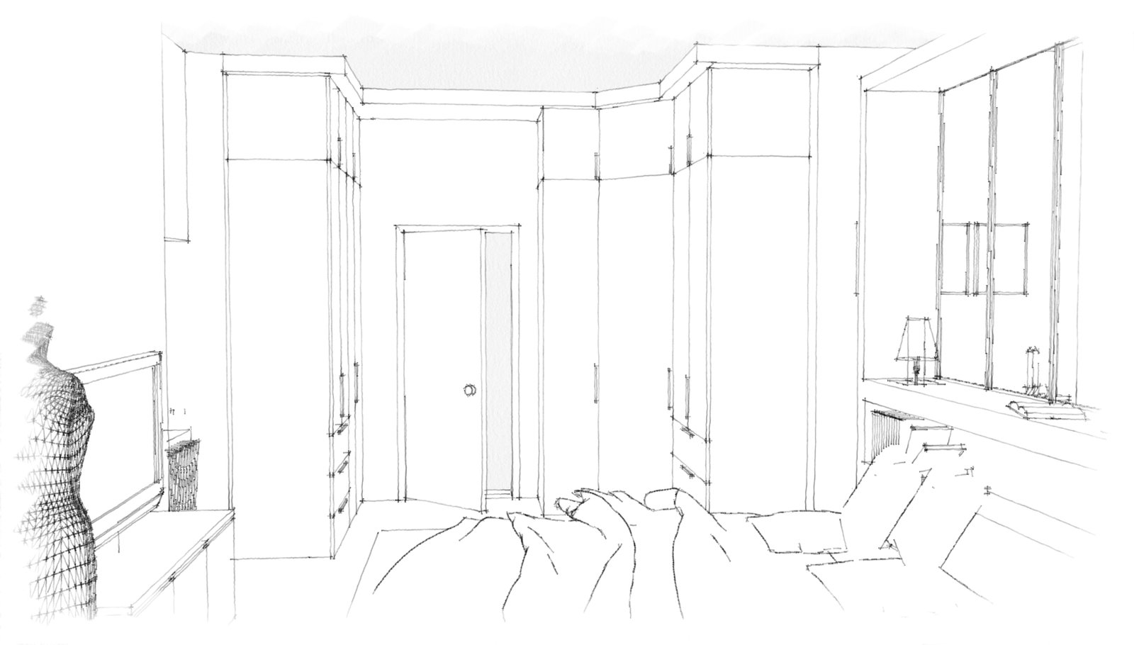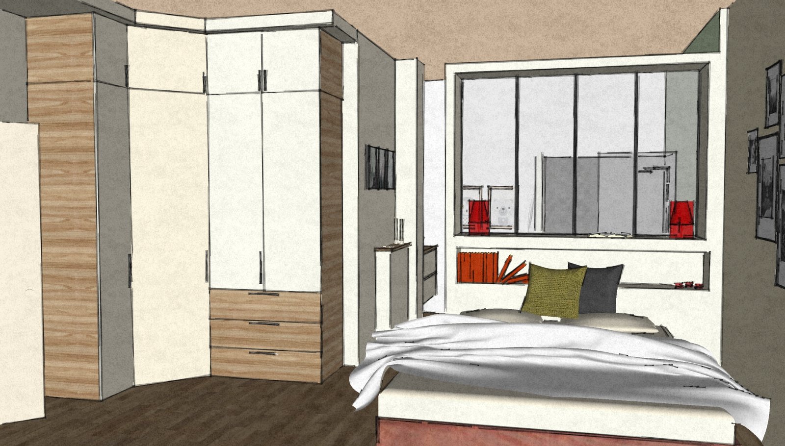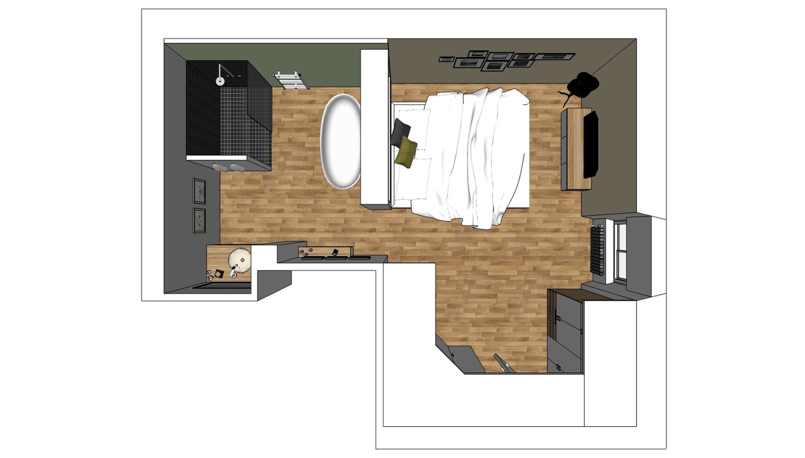 Le client est venu nous rencontrer pour réaménager sa chambre en suite parentale. Le principal questionnement de ce projet était de réussir à intégrer dans cette petite pièce l’ensemble de ses demandes : un dressing conséquent, une télévision au bout du lit, ainsi qu’une salle de bain ouverte avec une douche à l’italienne et une baignoire sur pied.​
